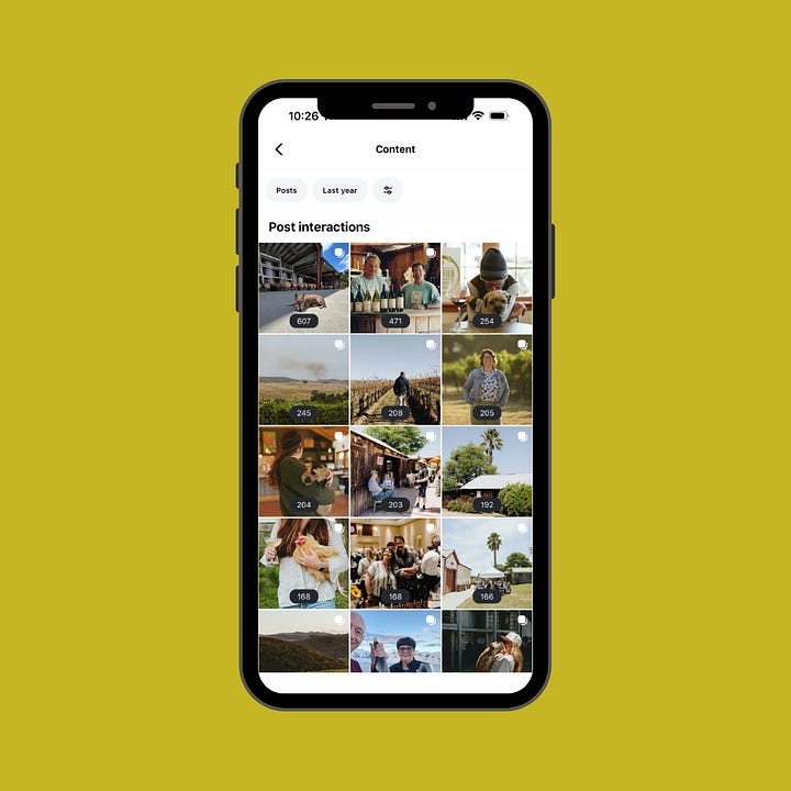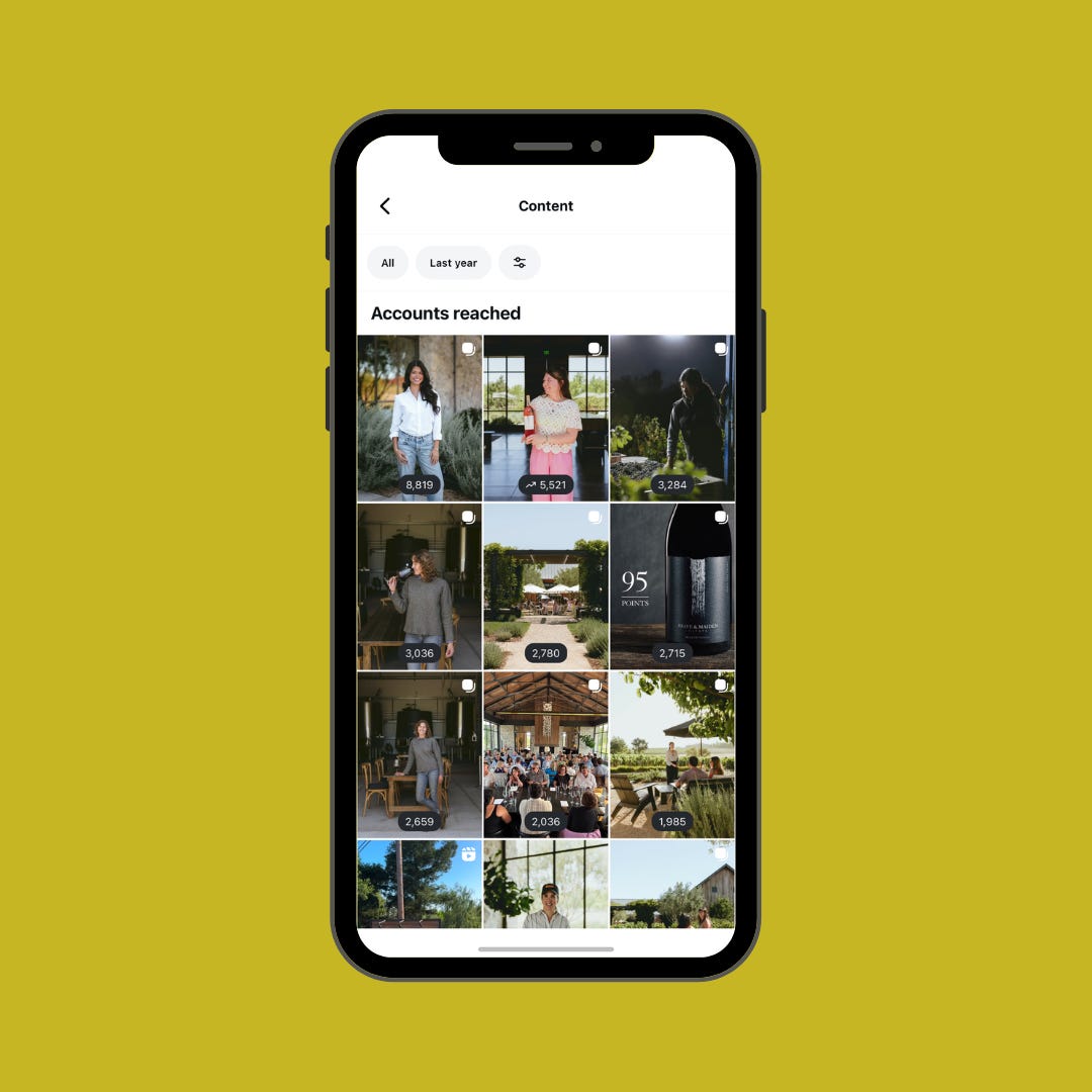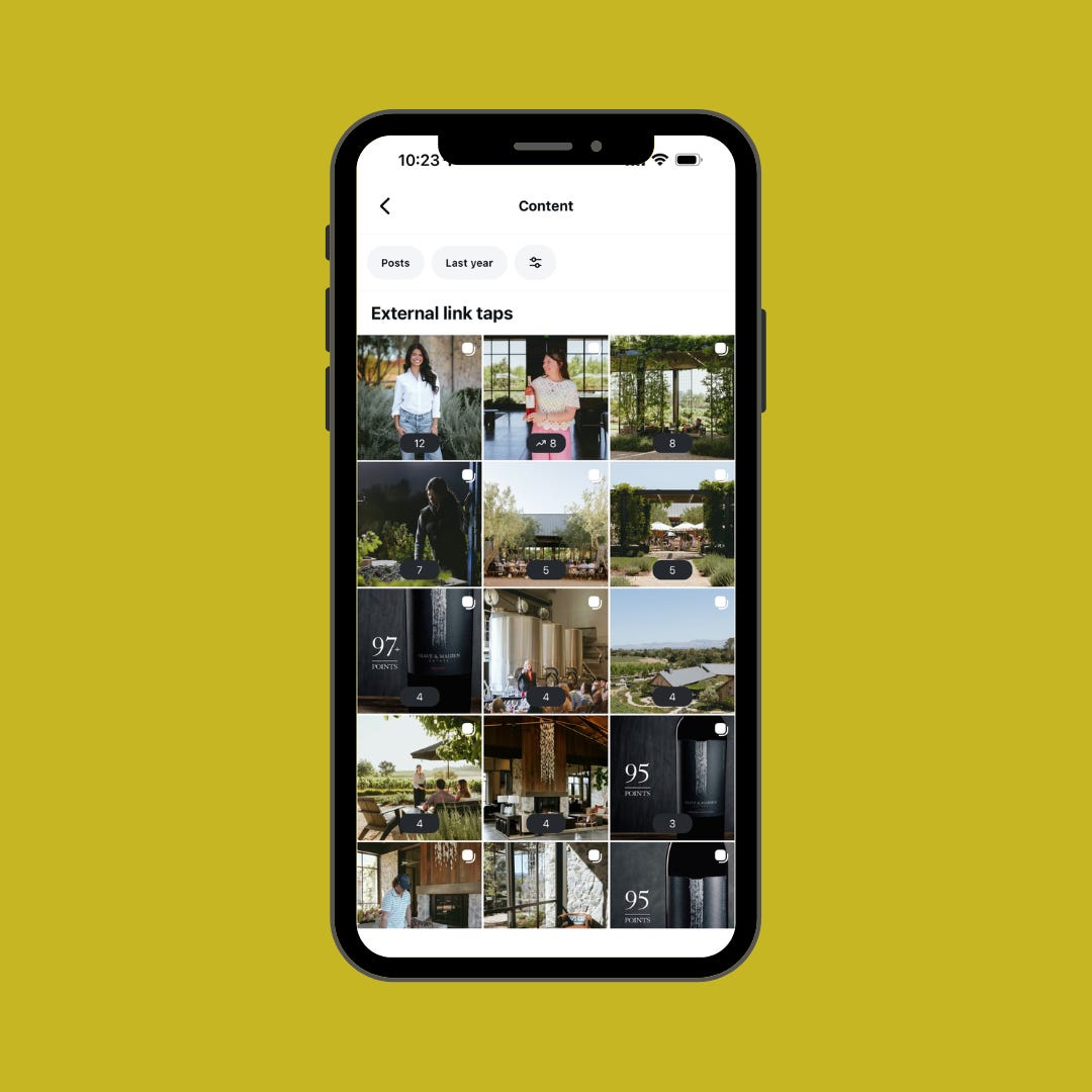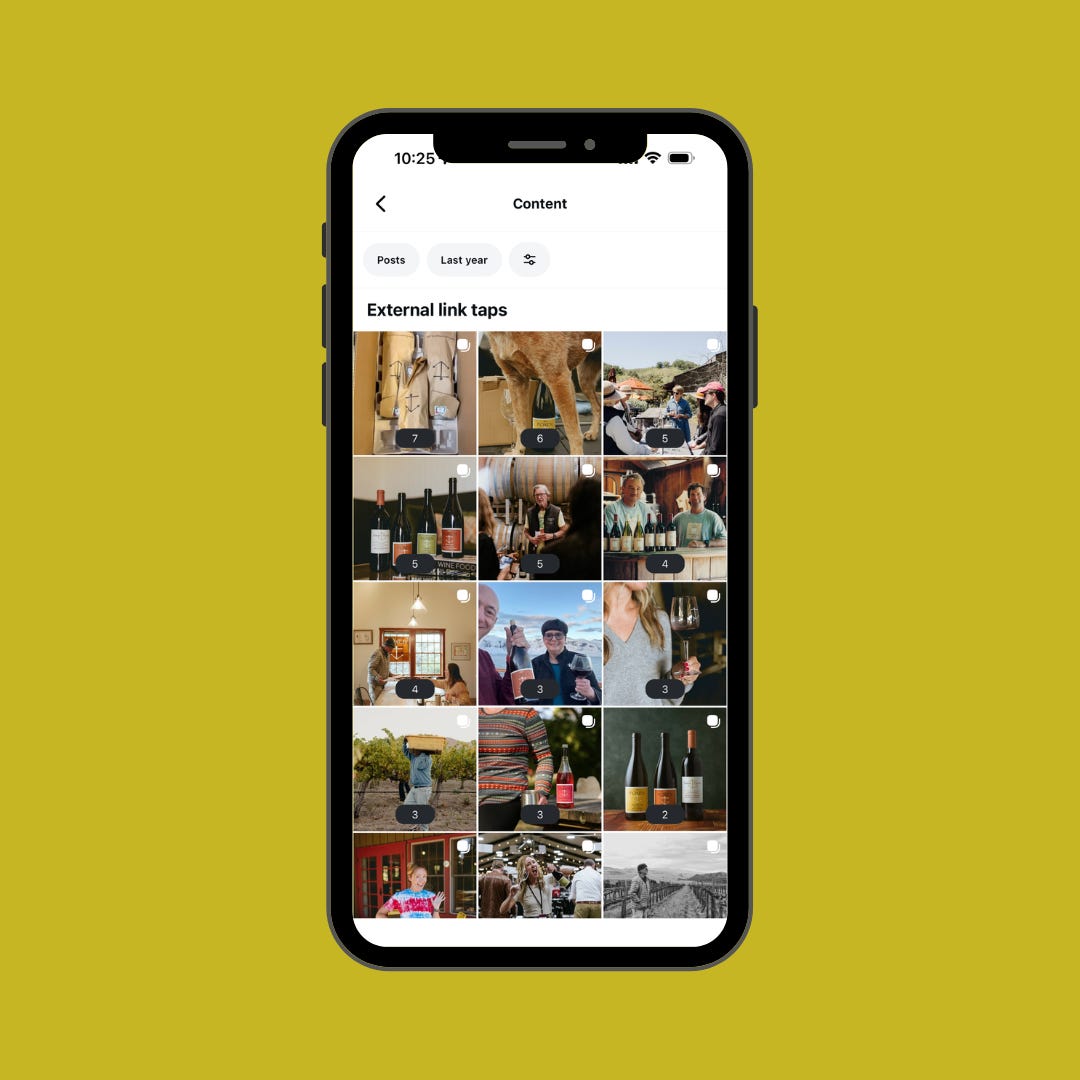 A lot of wineries express that online wine sales are an important goal, so it stands to reason that we want to also look at link clicks as a metric. Please note, though, that unfortunately, we can only track link clicks connected to regular posts like carousels and photos, as Reels don’t give us that data at this time. So, if you have a Reels-heavy strategy, then you might not get the data you want. That said, I’d still recommend looking at it because it can be enlightening.